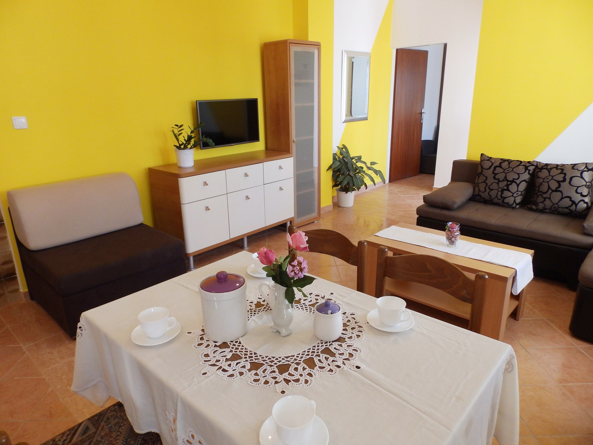 Die Wohnung verfügt über zwei gut ausgestattete Schlafzimmer, die bis zu sechs Gäste beherbergen können. Das Wohnzimmer ist geschmackvoll eingerichtet und bietet einen komfortablen Raum zum Entspannen und für gemeinsame Zeit mit Ihren Lieben.