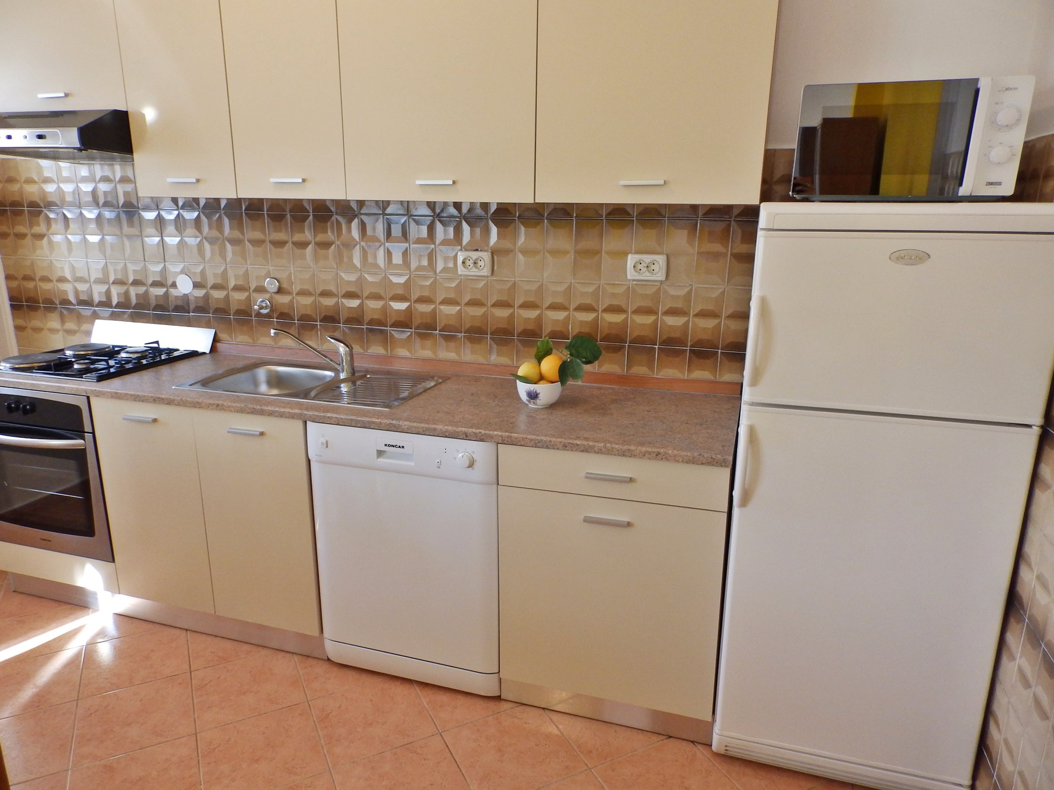 Die voll ausgestattete Küche ist eine Freude für diejenigen, die gerne selbst kochen. Sie ist mit allen notwendigen Geräten wie Kühlschrank, Gefrierschrank, Ofen, Mikrowelle und Kaffeemaschine ausgestattet.