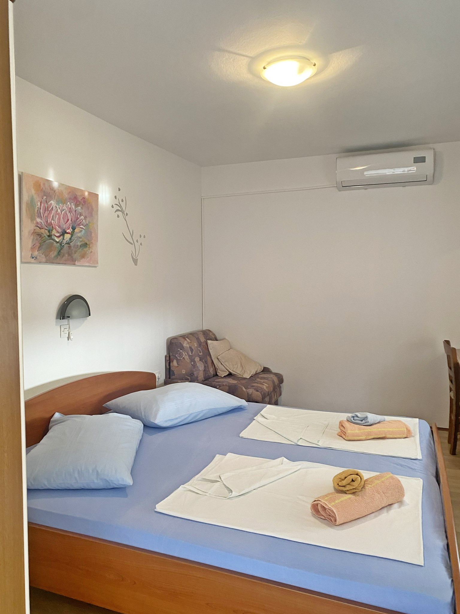 Beide Schlafzimmer verfügen über große Doppelbetten (180x200), und eines der Schlafzimmer hat eine eigene Klimaanlage.