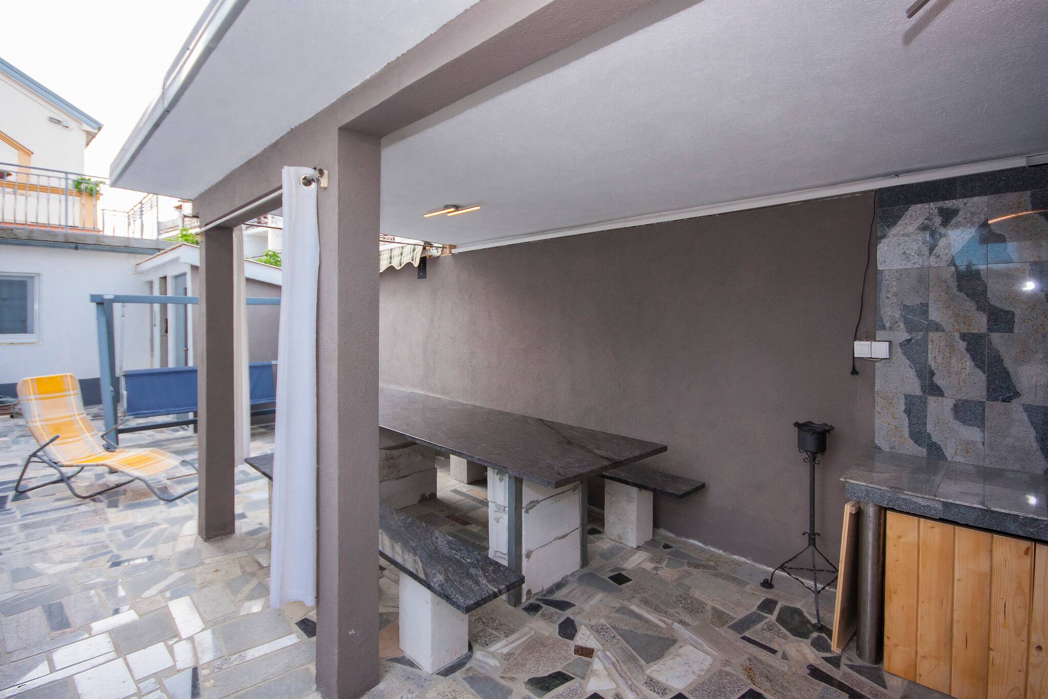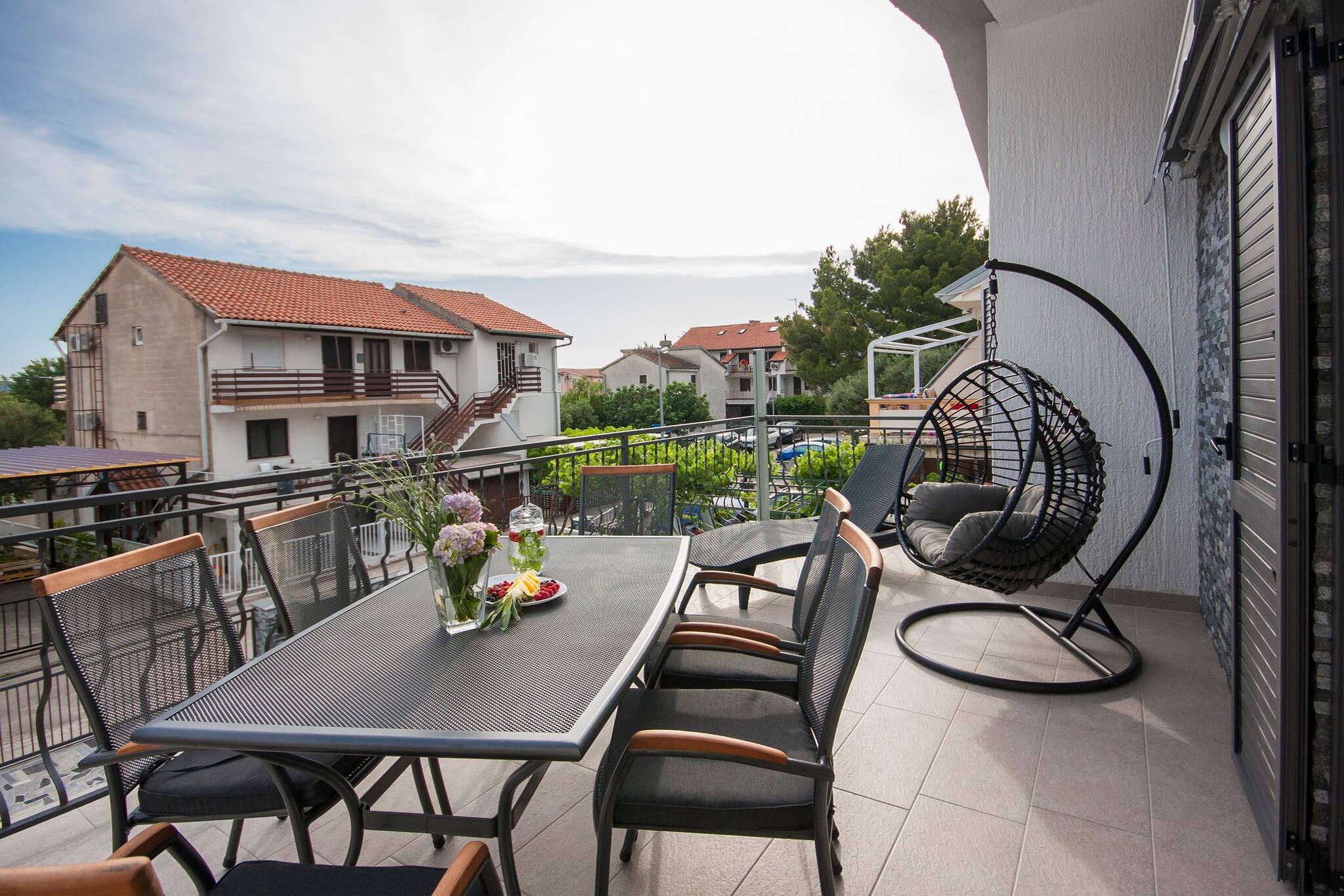 Die Wohnung verfügt auch über einen privaten Balkon oder eine Terrasse, wo Sie im Freien essen oder einfach nur die Sonne genießen können. Der Außenbereich ist mit bequemen Gartenmöbeln ausgestattet, und es steht ein Grill zur Verfügung.