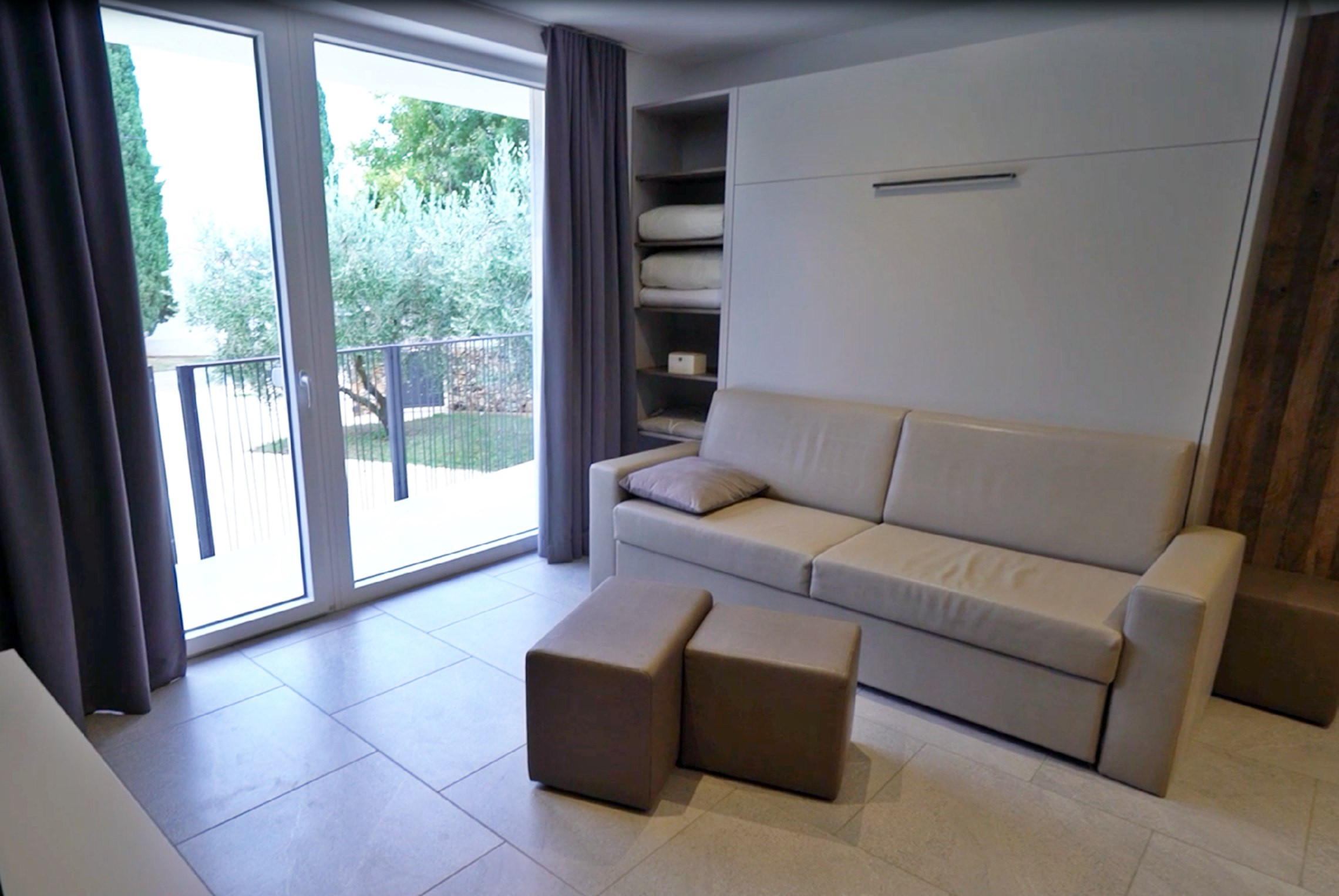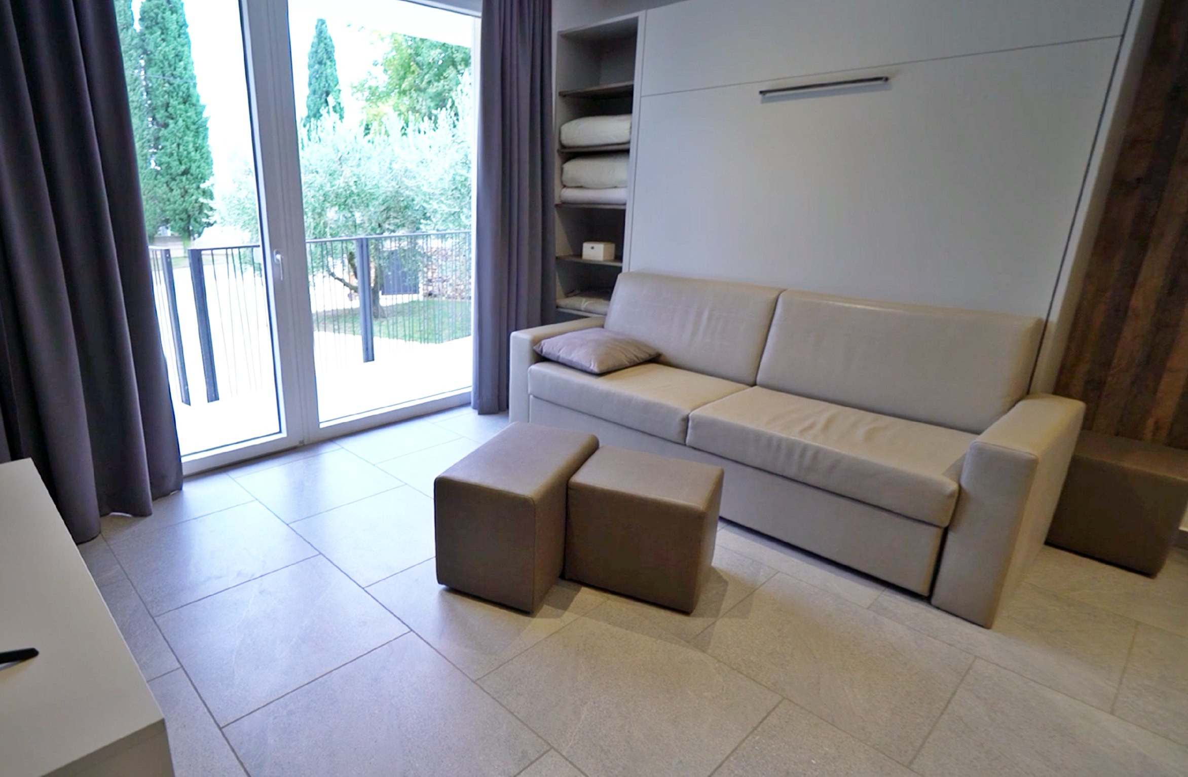 Die Wohnung kann bequem bis zu 6 Gäste aufnehmen. Die Schlafmöglichkeiten umfassen: ein Kingsize-Doppelbett, zwei Einzelbetten und ein Schrankbett im Wohnzimmer.
