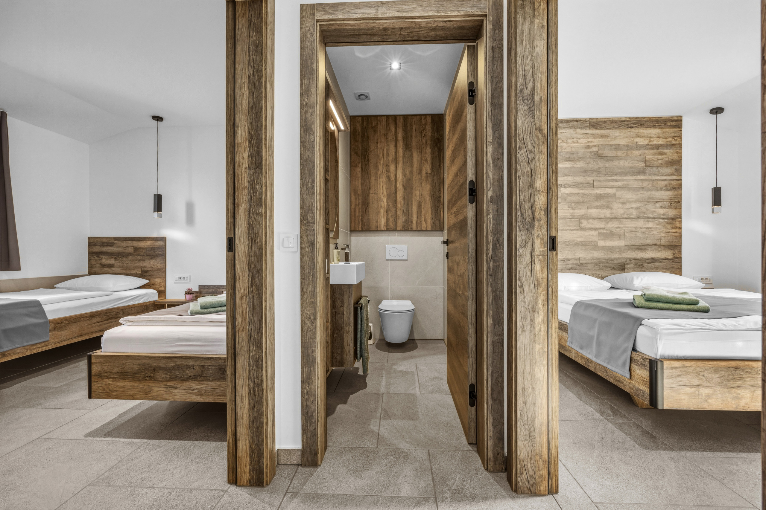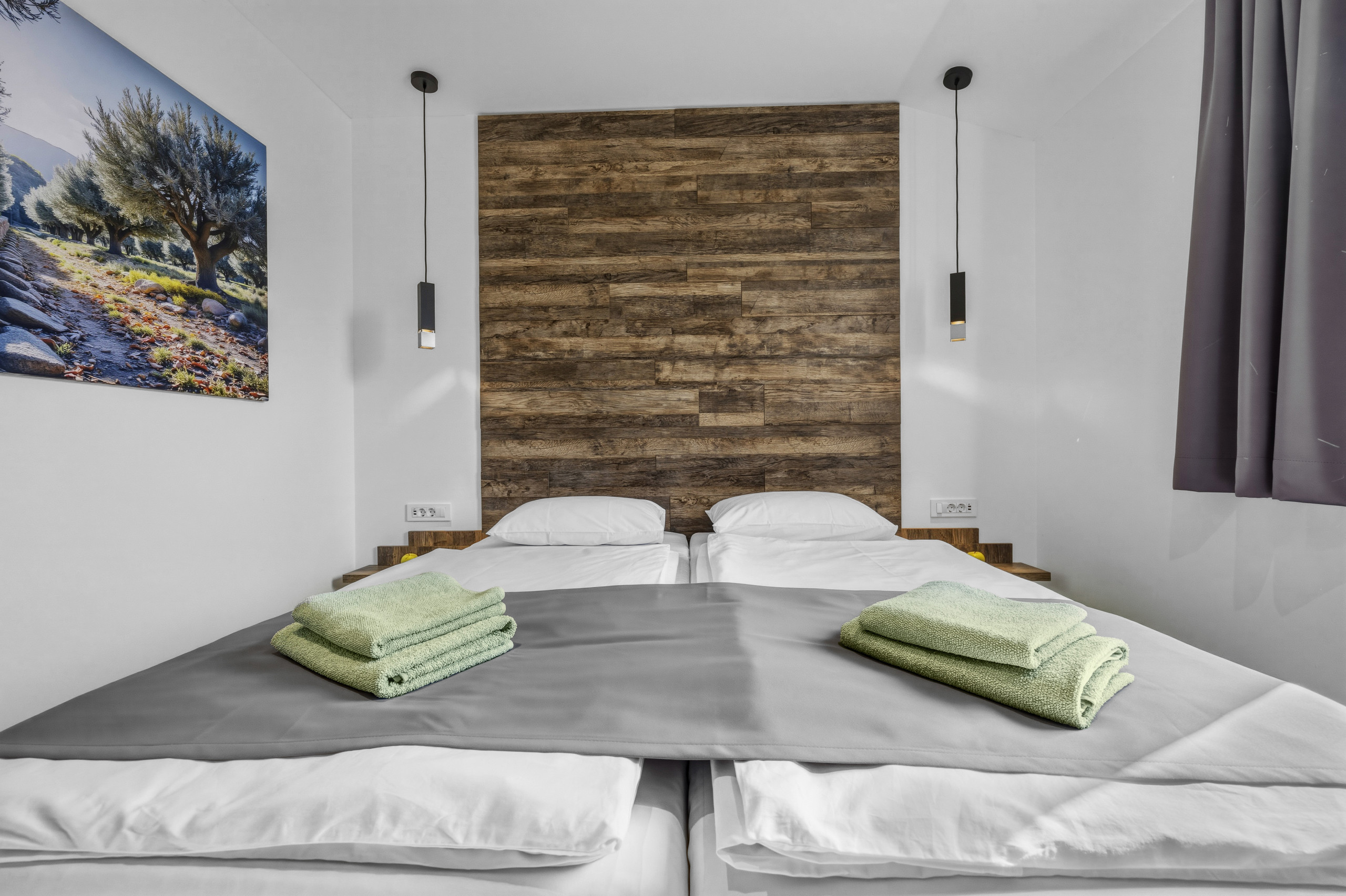 Die Wohnung kann bequem bis zu 6 Gäste aufnehmen. Die Schlafmöglichkeiten umfassen: ein Kingsize-Doppelbett, zwei Einzelbetten und ein Schrankbett im Wohnzimmer.