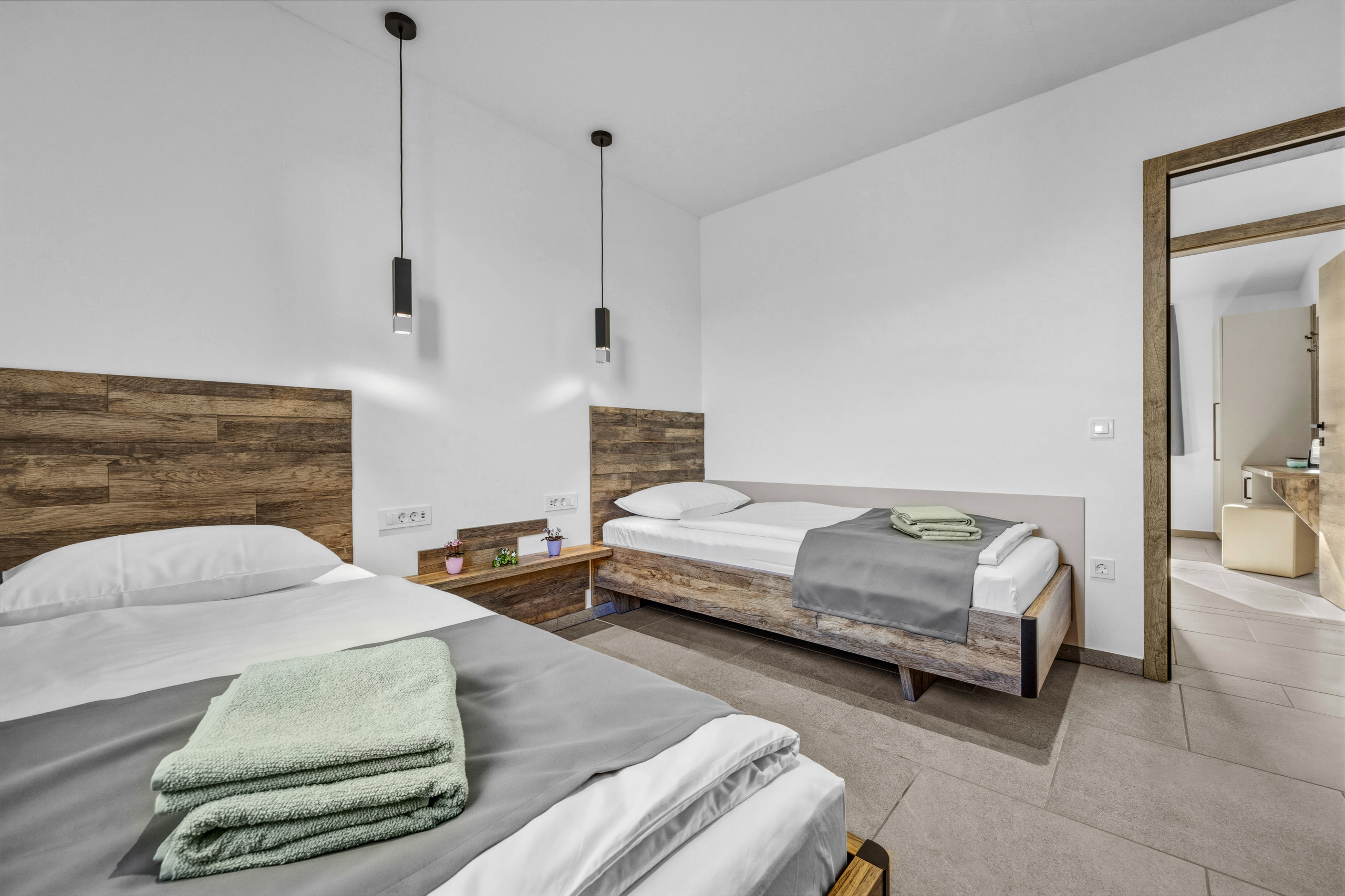 Die Wohnung kann bequem bis zu 6 Gäste aufnehmen. Die Schlafmöglichkeiten umfassen: ein Kingsize-Doppelbett, zwei Einzelbetten und ein Doppelschlafsofa im Wohnzimmer.