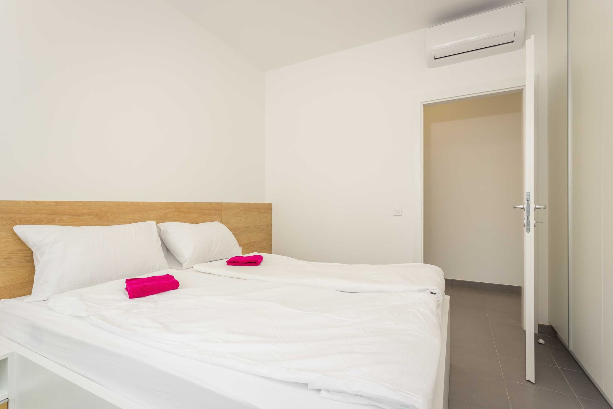 Das Apartment Olive befindet sich im Erdgeschoss. Die private Terrasse hat Blick auf den Kiefernwald/Park. Das Apartment ist neu eingerichtet und hell. Es besteht aus einem offenen Wohnzimmer mit Küchen-/Essbereich, zwei Schlafzimmern, einem Badezimmer und einer Terrasse. Beide Schlafzimmer sind mit Doppelbetten (160x200) ausgestattet und haben Klimaanlagen.