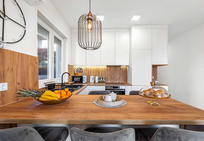 Die Wohnung verfügt über zwei Schlafzimmer, die bis zu 4 Gäste aufnehmen können. Das Hauptschlafzimmer bietet ein Queensize-Bett, während das zweite Schlafzimmer ein Doppelbett hat. Der Wohnbereich ist mit einem gemütlichen Sofa ausgestattet, das einen Raum zum Entspannen nach einem Tag voller Erkundungen bietet. Es gibt eine voll ausgestattete Küche mit Induktionsherd, Kühlschrank, Gefrierschrank, Backofen und Geschirrspüler, die es Ihnen ermöglichen, während Ihres Aufenthalts köstliche Mahlzeiten zuzubereiten.