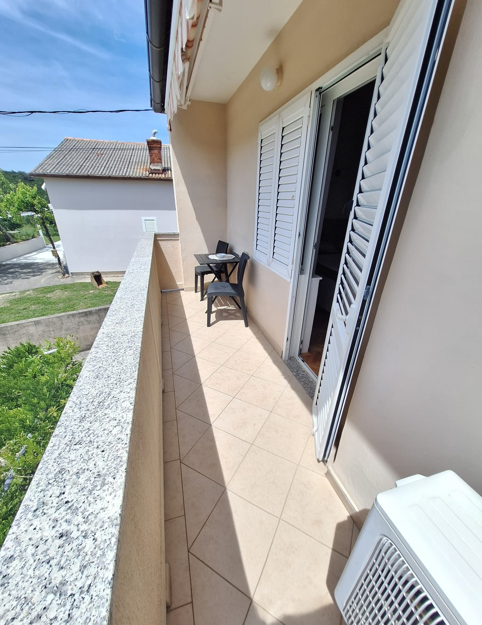 Die Wohnung verfügt über einen privaten Balkon mit einem wunderschönen Meerblick, perfekt für entspannte Morgen oder warme Abende an der Küste. Die Gäste haben außerdem Zugang zu einem gemeinsamen Waschraum mit Waschmaschine, Trockner und Bügeleisen, was zusätzliche Bequemlichkeit während Ihres Aufenthalts bietet.