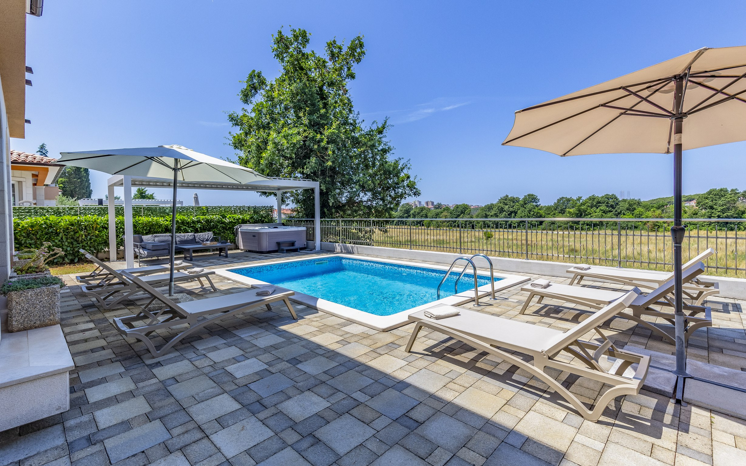 Innerhalb eines exklusiven Anwesens in Pula befindet sich diese elegante Villa mit vier Schlafzimmern, die großzügigen Platz für bis zu 10 Gäste (8 Erwachsene und 2 Kinder) bietet und somit die perfekte Wahl für Großfamilien oder Freundesgruppen ist, die Wert auf Privatsphäre, Komfort und eine entspannte mediterrane Atmosphäre legen.