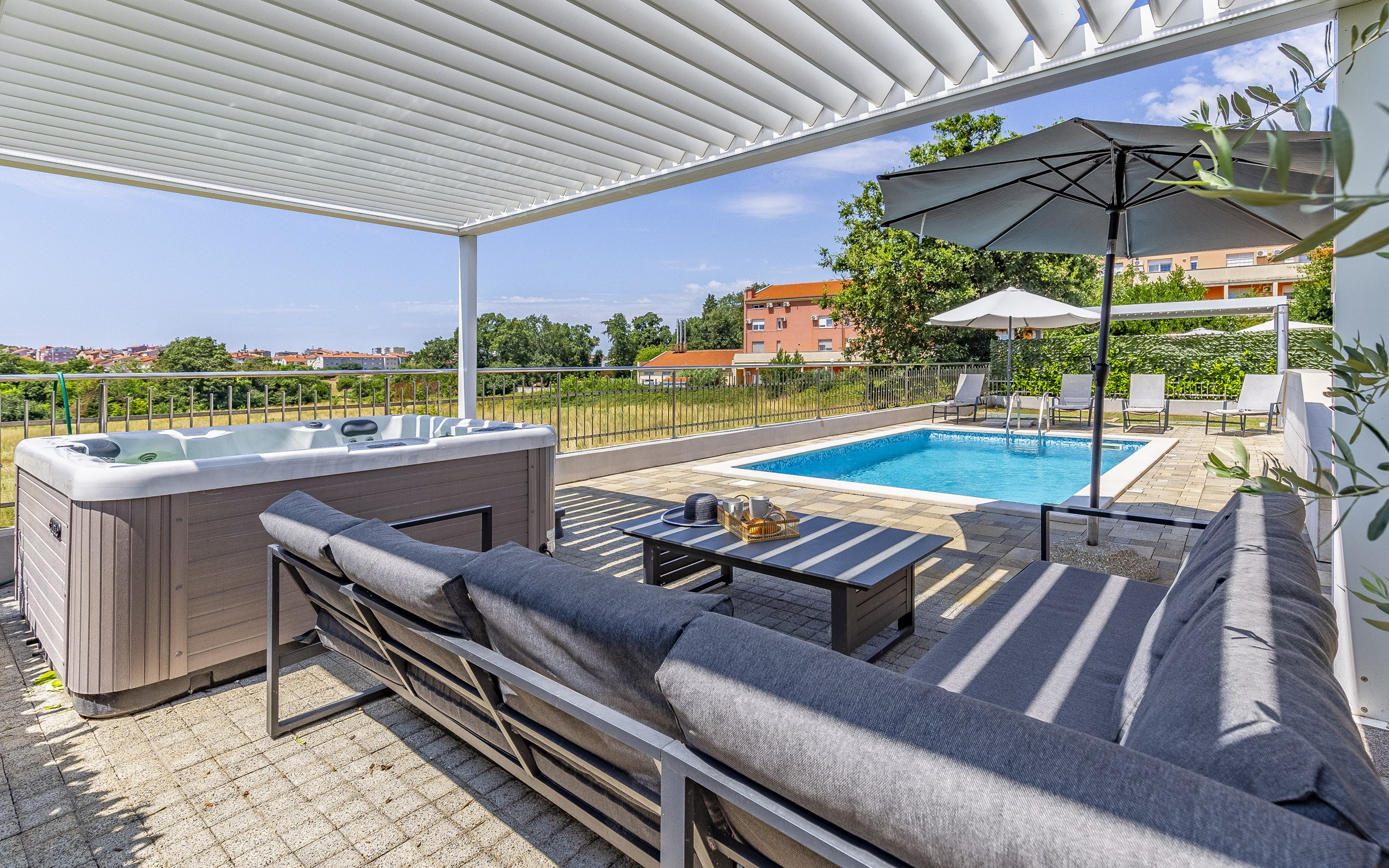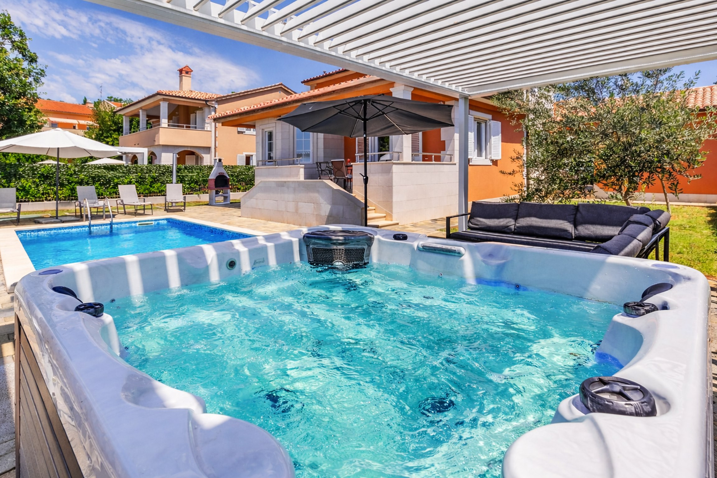 Das Outdoor-Leben steht im Mittelpunkt des Erlebnisses. Der private Gartenbereich lädt die Gäste ein, sich am Swimmingpool zu entspannen, in der Whirlpool zu relaxen oder Mahlzeiten vom Grill im überdachten Loungebereich zu genießen.
