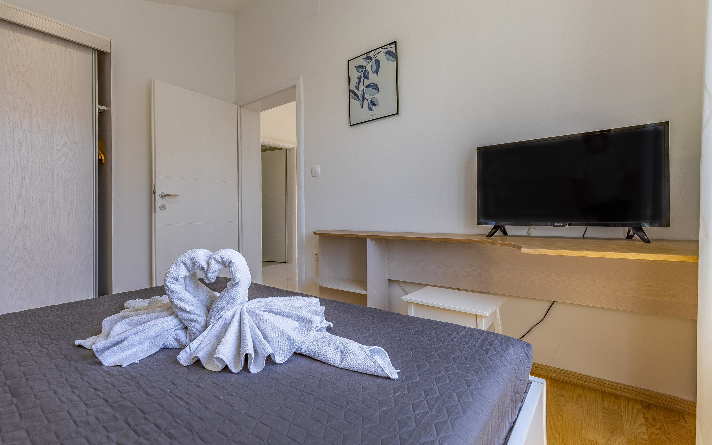 Das Interieur ist sorgfältig gestaltet, um einen natürlichen Übergang zwischen gemeinsamen und privaten Bereichen zu ermöglichen. Es verfügt über vier komfortable Schlafzimmer, ein einladendes Wohnzimmer, das mit natürlichem Licht durchflutet ist, einen Essbereich, der perfekt zum Zusammenkommen geeignet ist, und eine vollständig ausgestattete Küche mit allen wesentlichen Geräten und Kochutensilien für einen mühelosen Aufenthalt.
