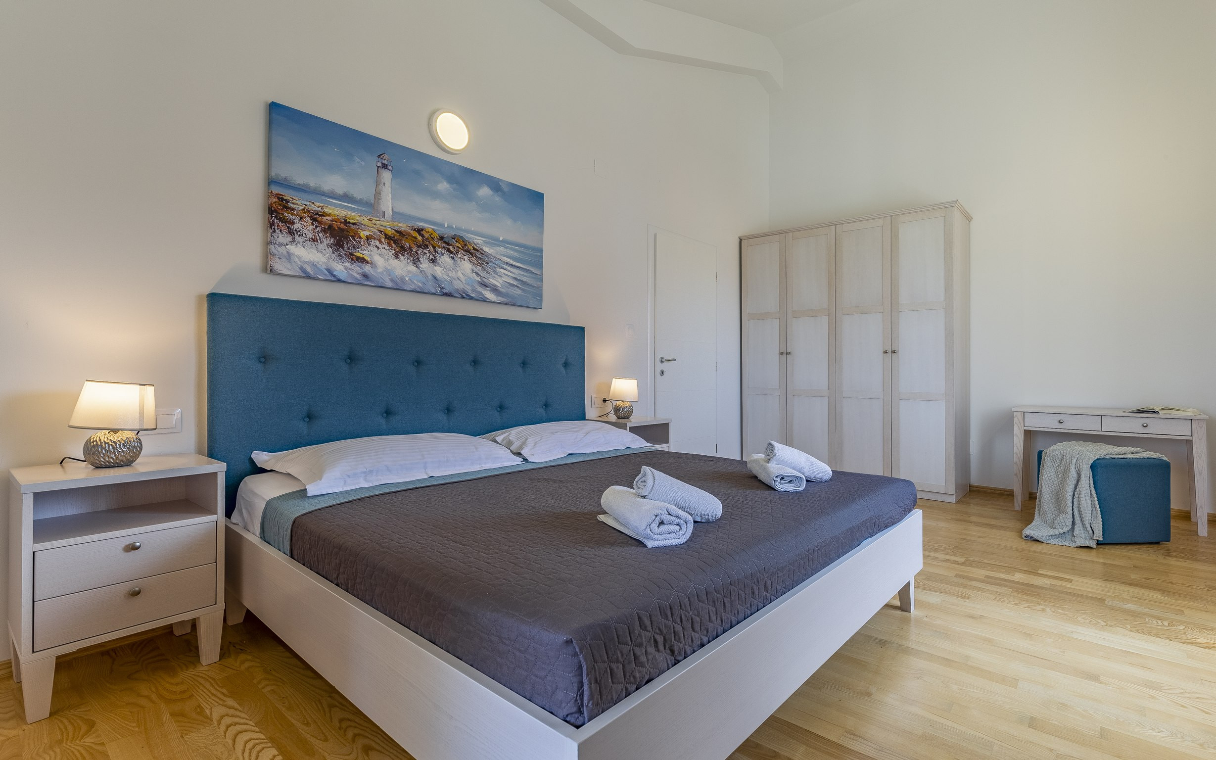Das Interieur ist sorgfältig gestaltet, um einen natürlichen Übergang zwischen gemeinsamen und privaten Bereichen zu ermöglichen. Es verfügt über vier komfortable Schlafzimmer, ein einladendes Wohnzimmer, das mit natürlichem Licht durchflutet ist, einen Essbereich, der perfekt zum Zusammenkommen geeignet ist, und eine vollständig ausgestattete Küche mit allen wesentlichen Geräten und Kochutensilien für einen mühelosen Aufenthalt.