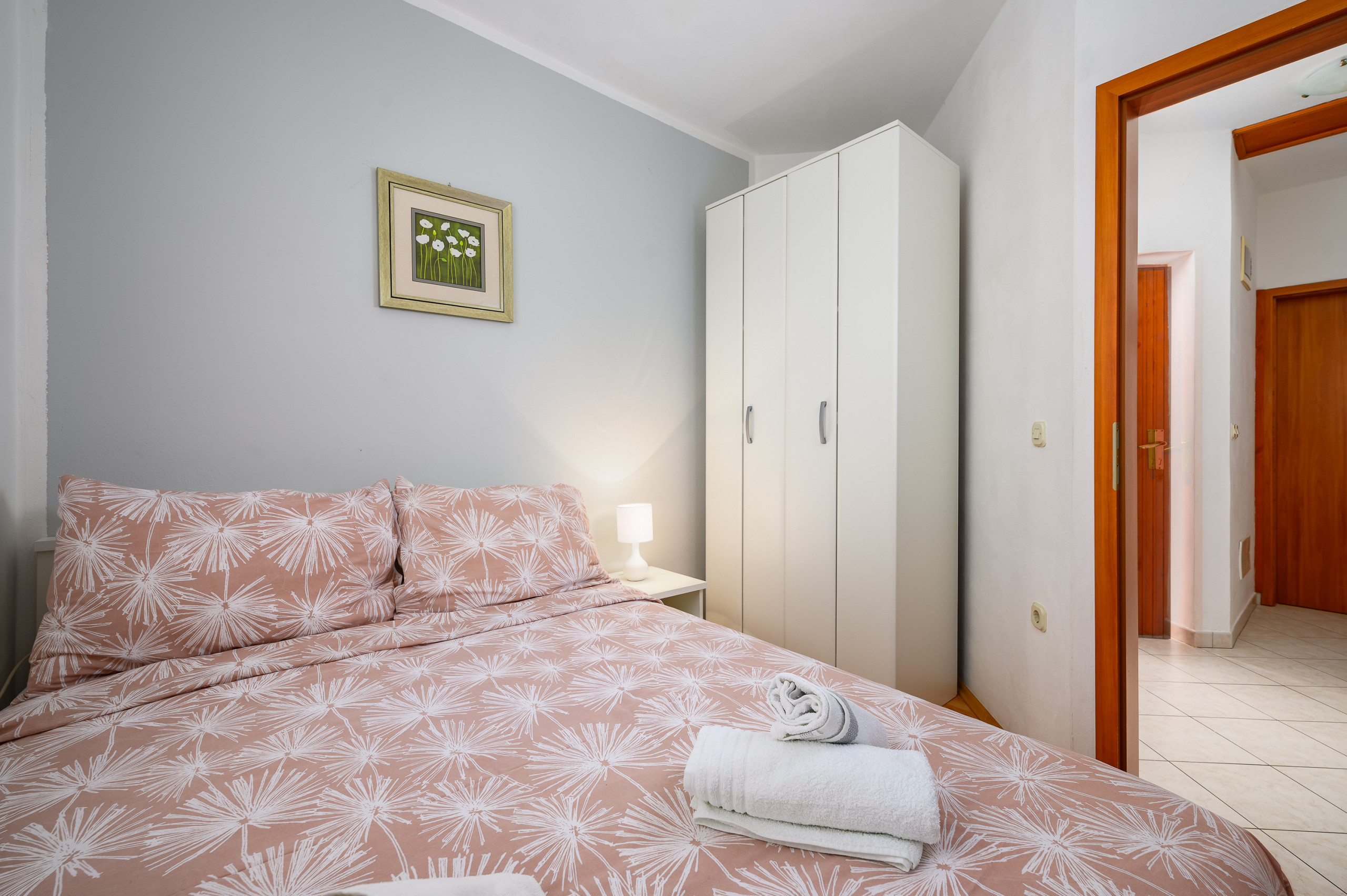 Apartment can accommodate 4 people. It has 2 bedrooms, and each of them has a double bed where 2 people can sleep. Baby cot is available upon request (so as a highchair).