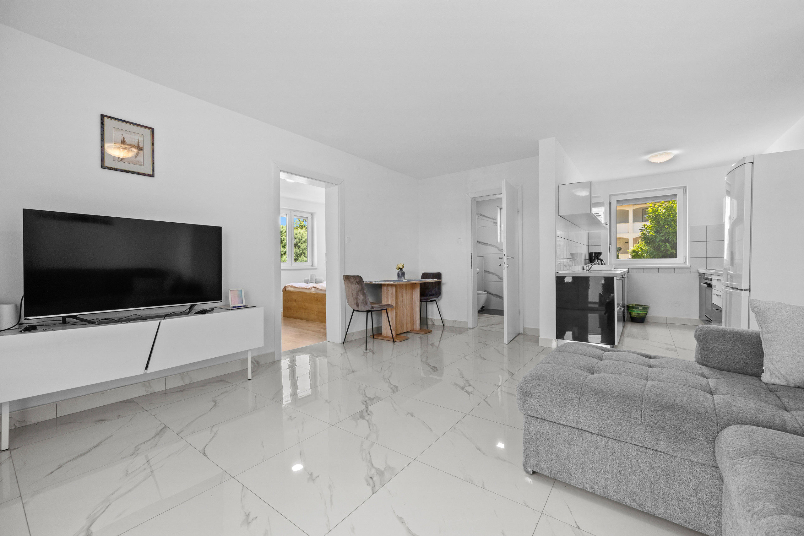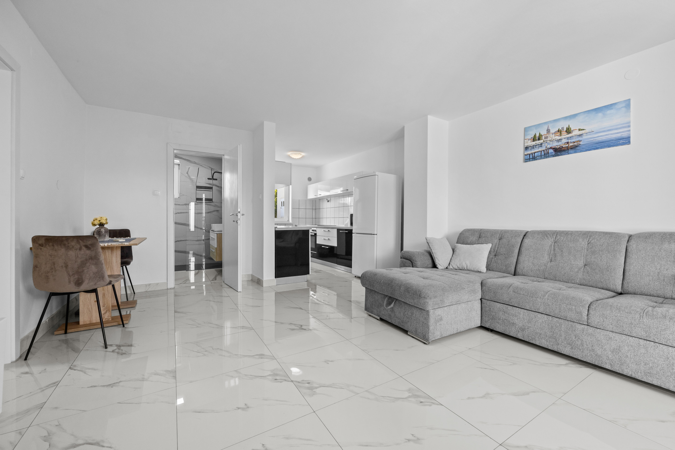 There are two bedrooms with king-size beds for a comfortable night’s rest, while the living room with a smart TV and the terrace equipped with outdoor seating and a dining table provide great spaces for relaxing and socializing.