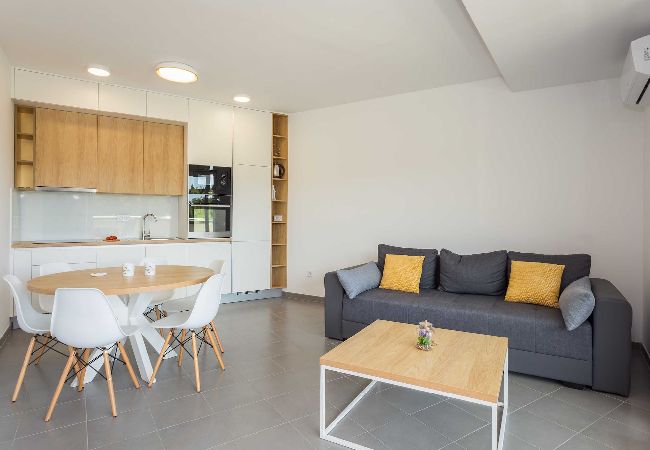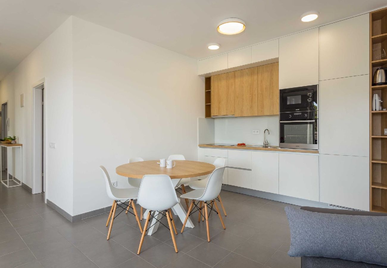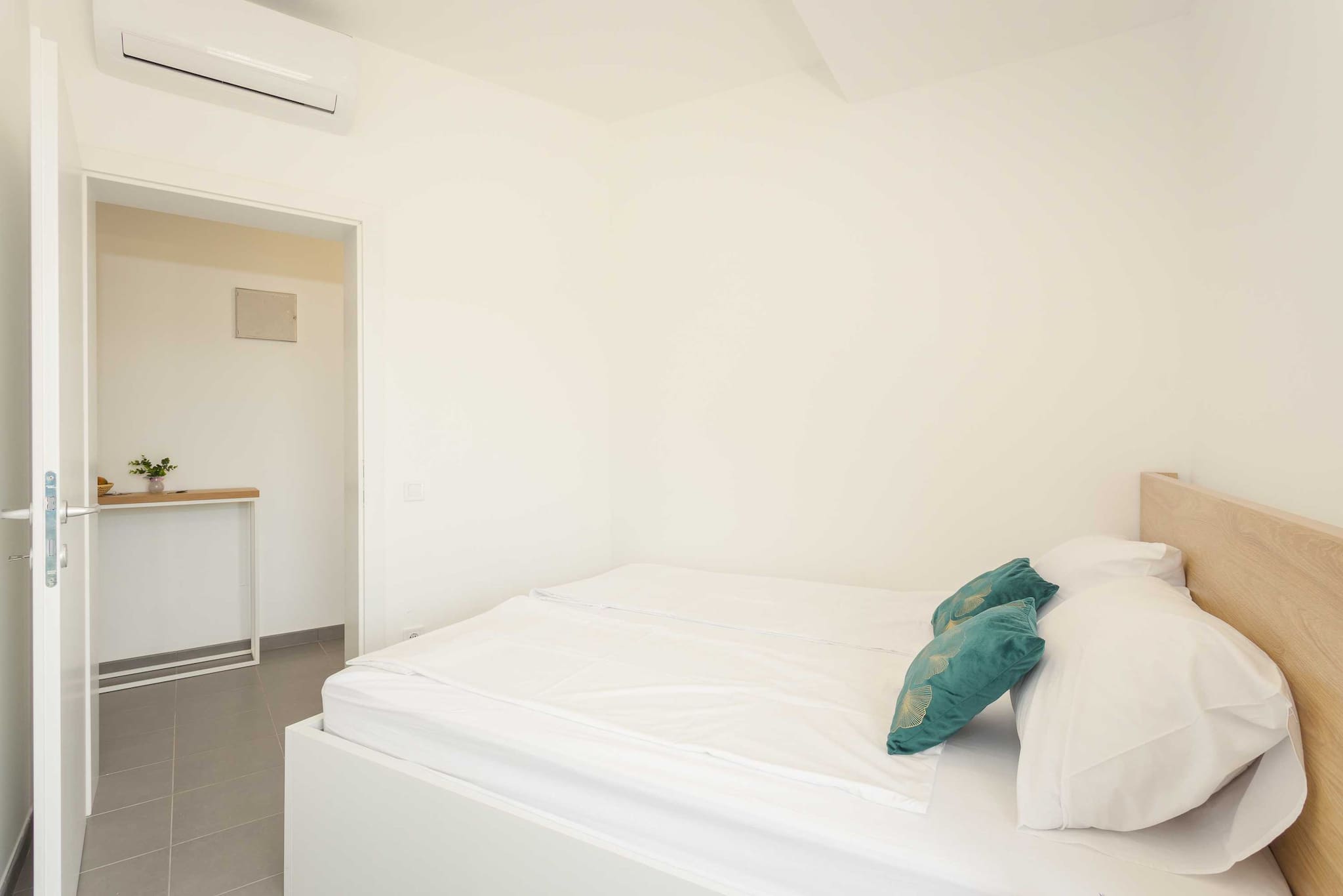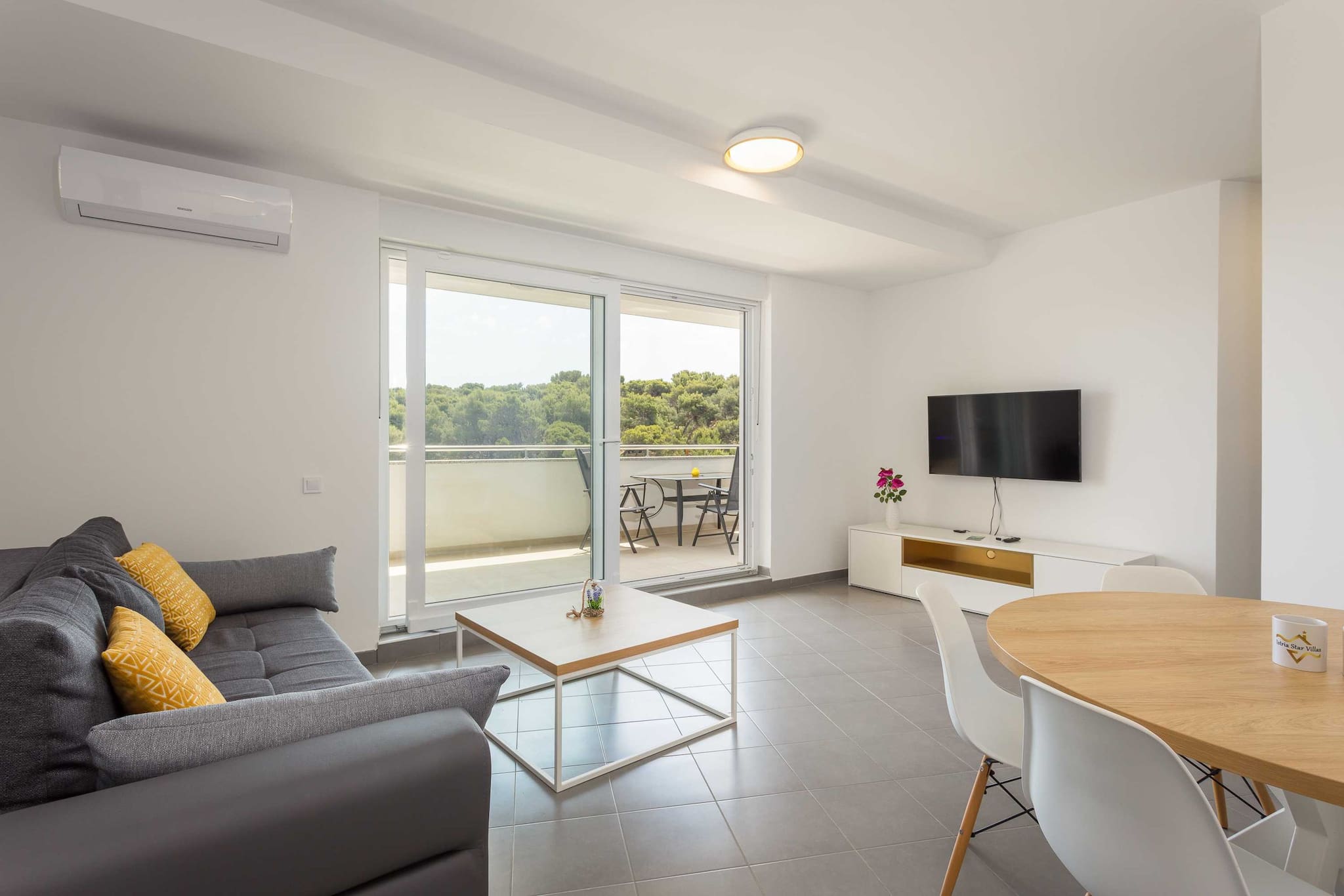 Apartment Olive is located on ground floor. The private terrace is facing the pine forrest/park. The apartment is newly furnished and bright. It consists of an open plan living room with a kitchen/dining area, two bedrooms, bathroom and a terrace. Both bedrooms are furnished with double beds (160x200) and have air conditioning units.