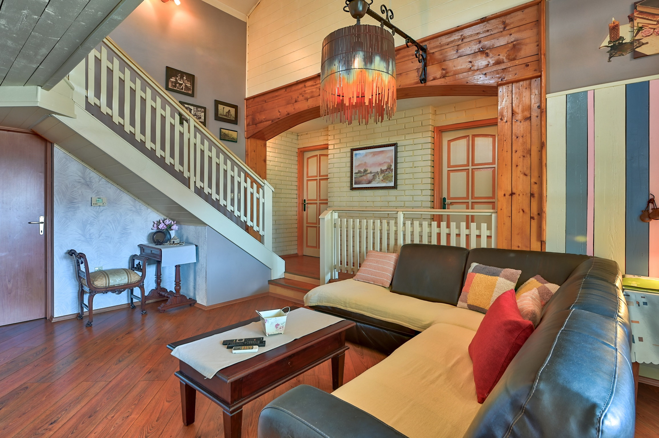 A galery above the living room provides a comfortable space for reading or exercising, and it is especially liked by children.