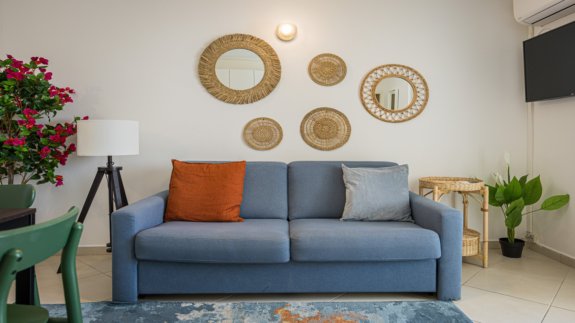 This cozy one bedroom apartment can accommodate 2 adults and 2 children up to 11,99 years old, featuring a queen-size bed in the living area and a convenient bunk bed in the bedroom. Enjoy the convenience of equipped kitchenette with essential appliances like a stove, fridge, water kettle, toaster microwave, kitchenware and dining table. The apartment boasts modern amenities including air conditioning, WiFi, a satellite TV and a personal safe for your valuables. Bathroom is equipped with shower, toilet and hairdryer. There is also an entrance to the balcony with outdoor furniture.