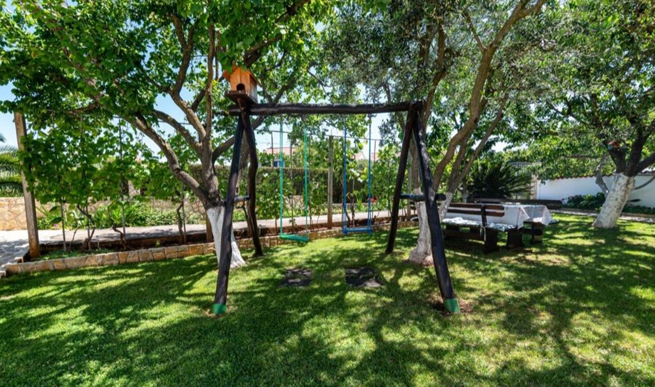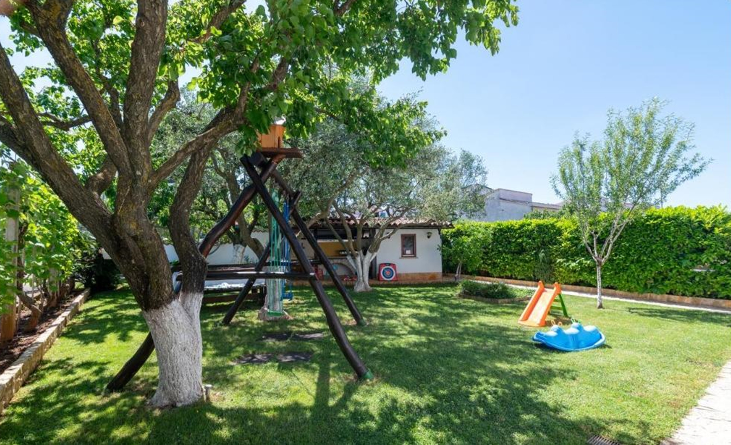 The private, 25 m² roffed terrace overlooks the garden. You can enjoy your meals or lounge on the sunloungers, while children can play on a dedicated play area.
