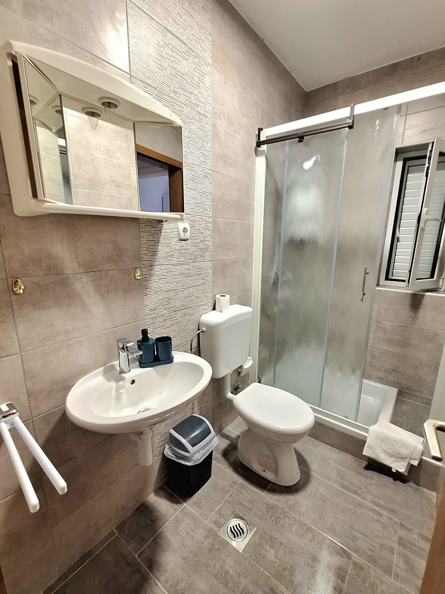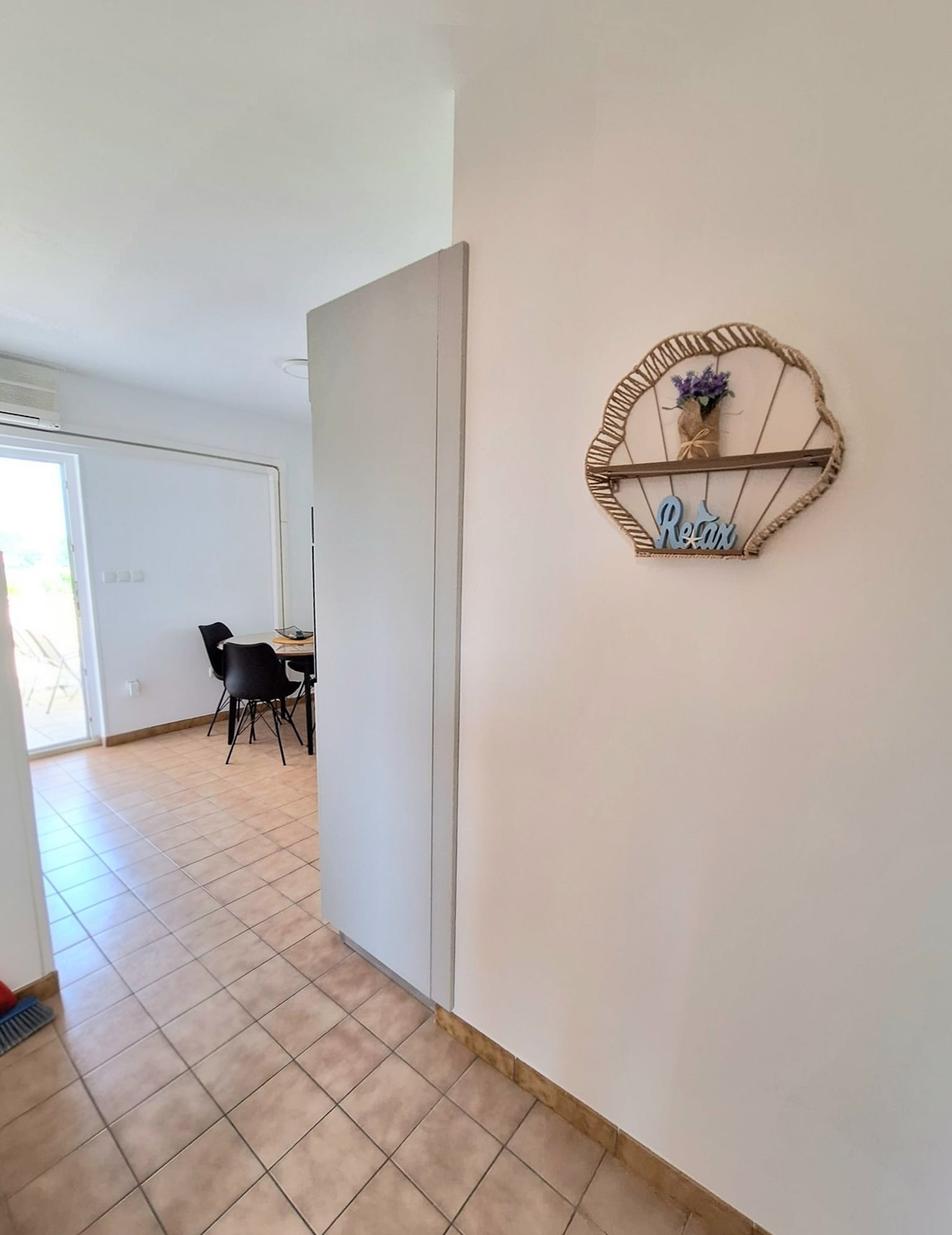 The apartment features two balconies with a magical view of the sea, perfect for enjoying your morning coffee or unwinding in the evening while listening to the waves. Guests also have access to a shared laundry room equipped with a washing machine, dryer, and iron, making longer stays easy and convenient.