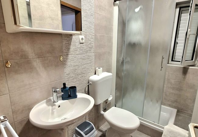 The apartment features a balcony with a lovely view of the sea, a perfect spot to enjoy your morning coffee or the warm evening breeze. Guests also have access to a shared laundry room with a washing machine, dryer, and iron, which is especially convenient for longer stays.
