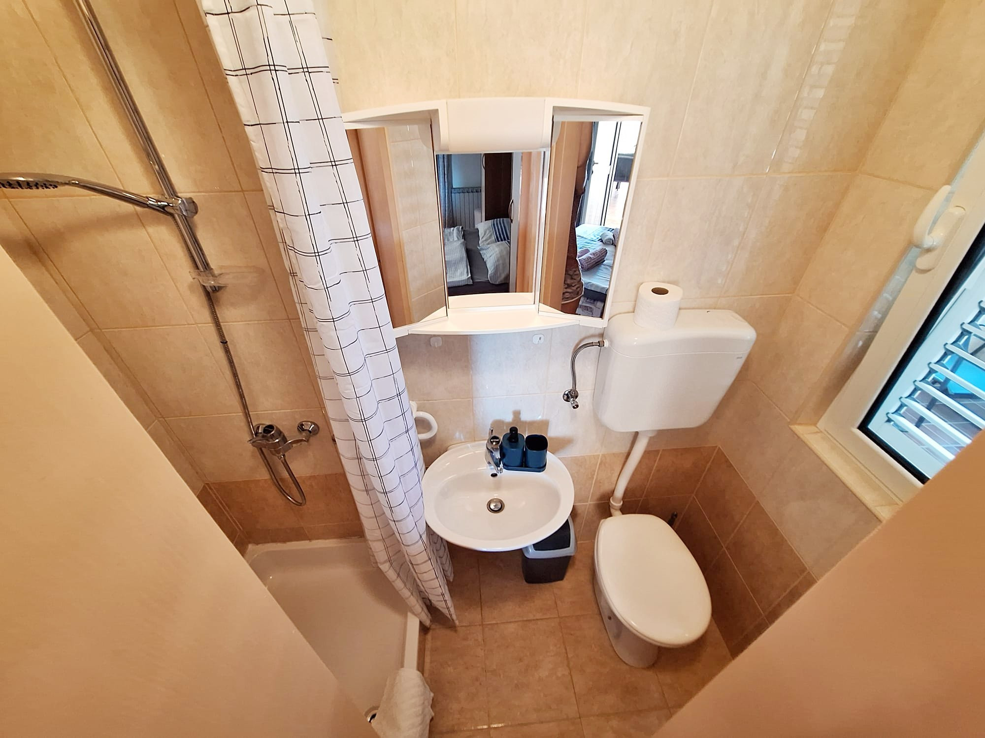 The apartment features a balcony with a lovely view of the sea, a perfect spot to enjoy your morning coffee or the warm evening breeze. Guests also have access to a shared laundry room with a washing machine, dryer, and iron, which is especially convenient for longer stays.