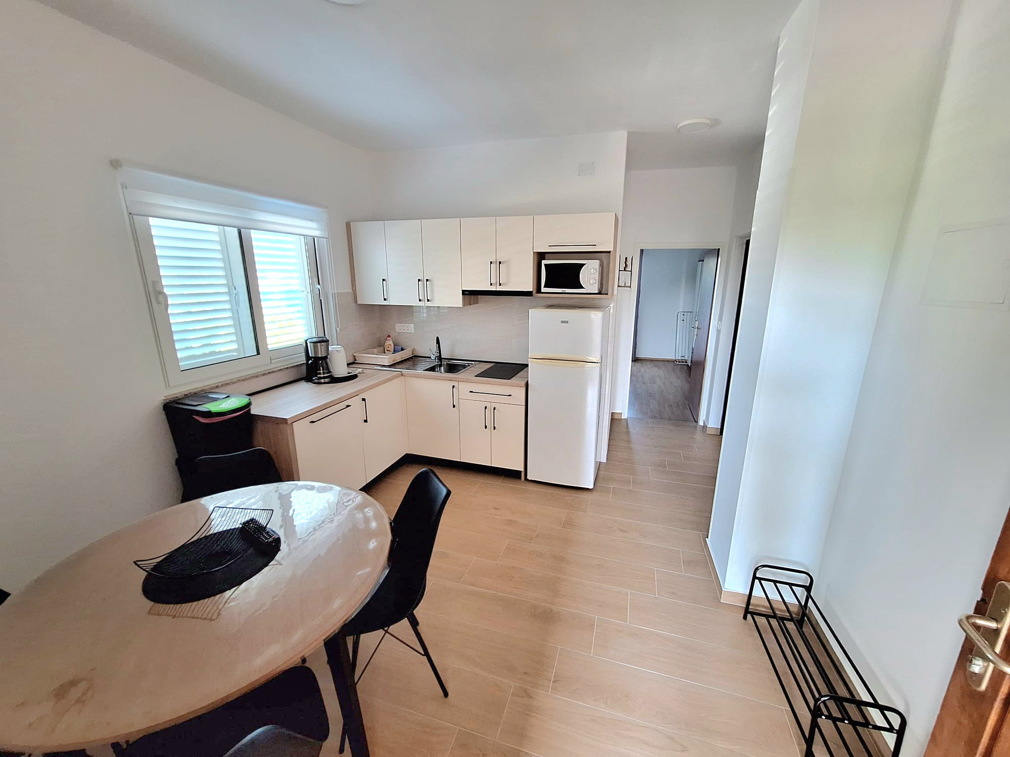 The open-plan electric kitchen is fully equipped with a refrigerator, microwave, freezer, dishwasher, coffee machine, kettle, and all necessary dishes, plates, bowls, cutlery, and kitchen utensils, making it easy to prepare simple meals during your stay.