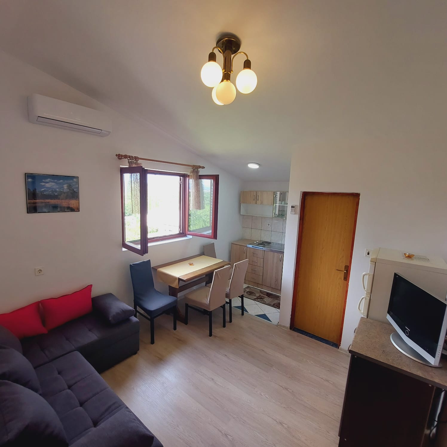 The apartment offers a sea view through the window. There is a double sofa bed with flat screen TV in the living room and king-size bed in the bedroom. There is also a kitchenette with a dining table, stove, microwave, fridge, freezer, kettle and all the plates, bowls, and utensils you'll need. Private bathroom with a shower.