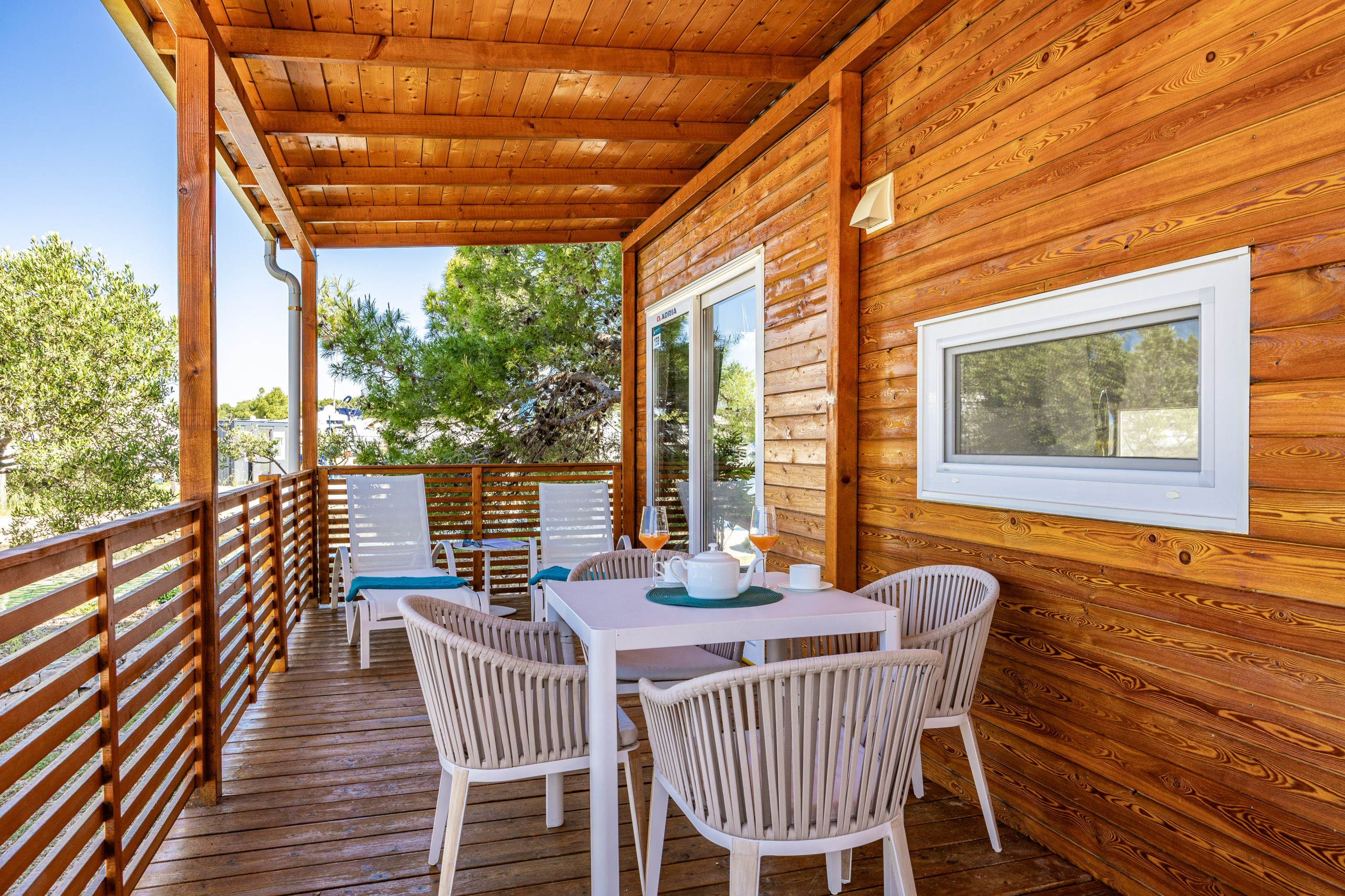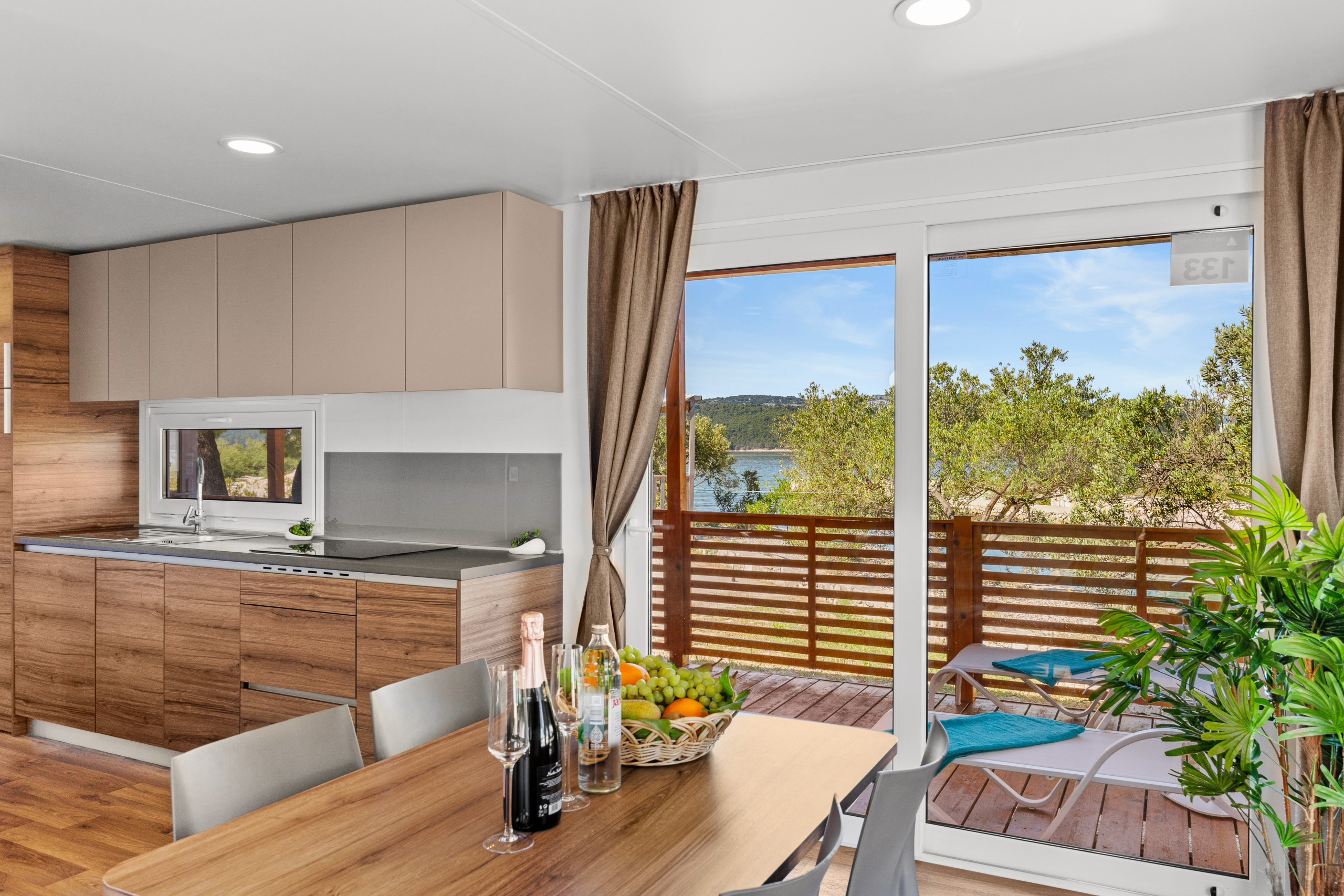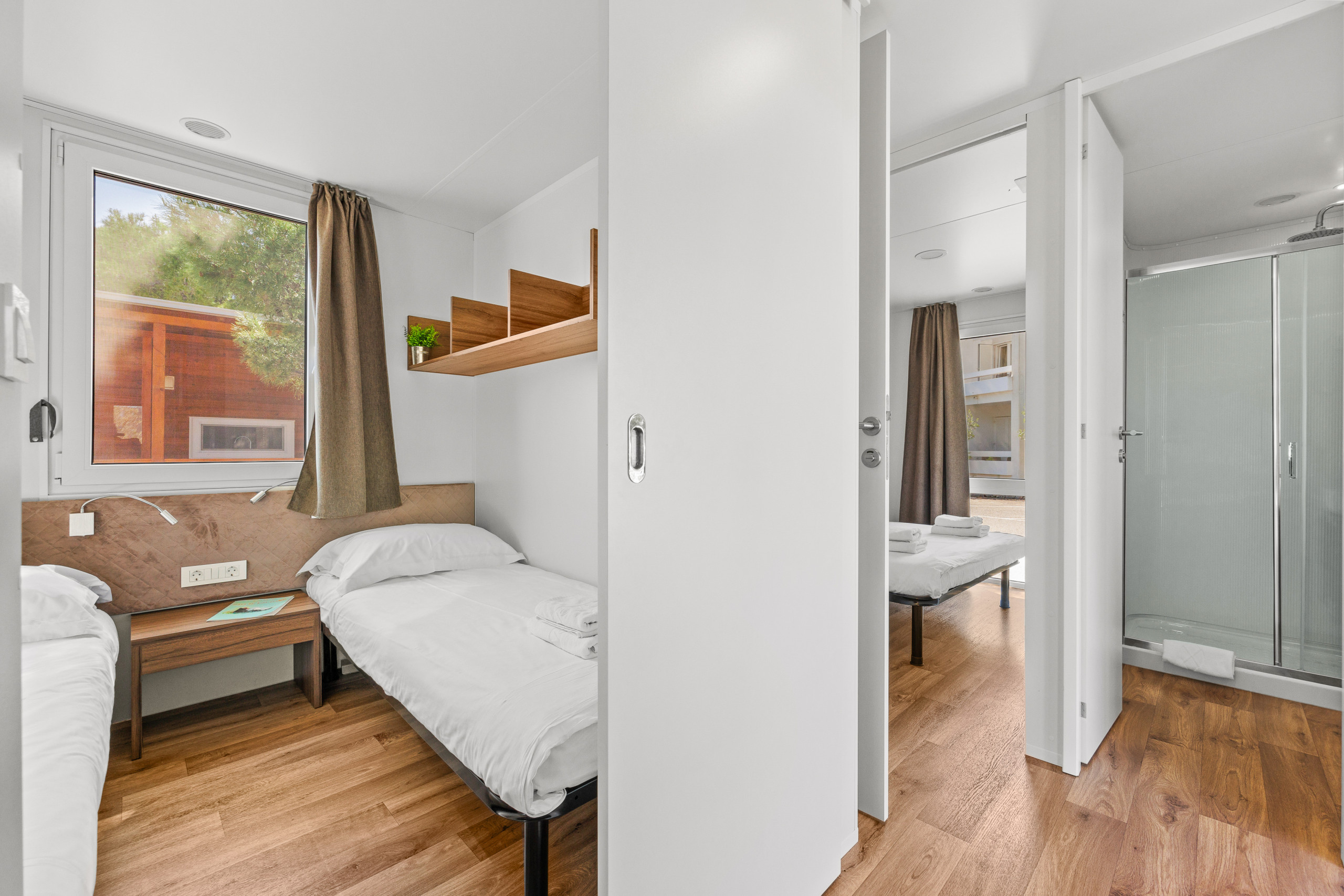 The mobile home comfortably accommodates up to 6 guests, featuring 3 bedrooms with a mix of double and individual beds. The interior boasts modern amenities including a fully equipped American-style kitchen with essential appliances, a flat-screen TV, and WiFi to keep everyone connected. Air conditioning ensures comfort during warm summer days.