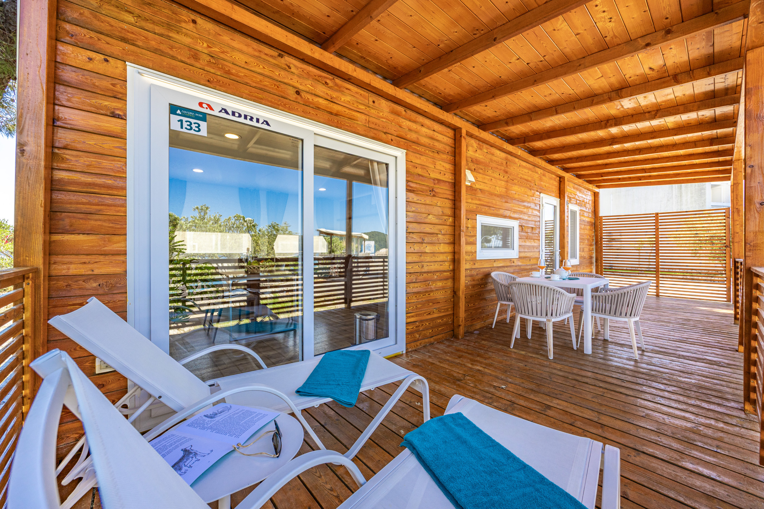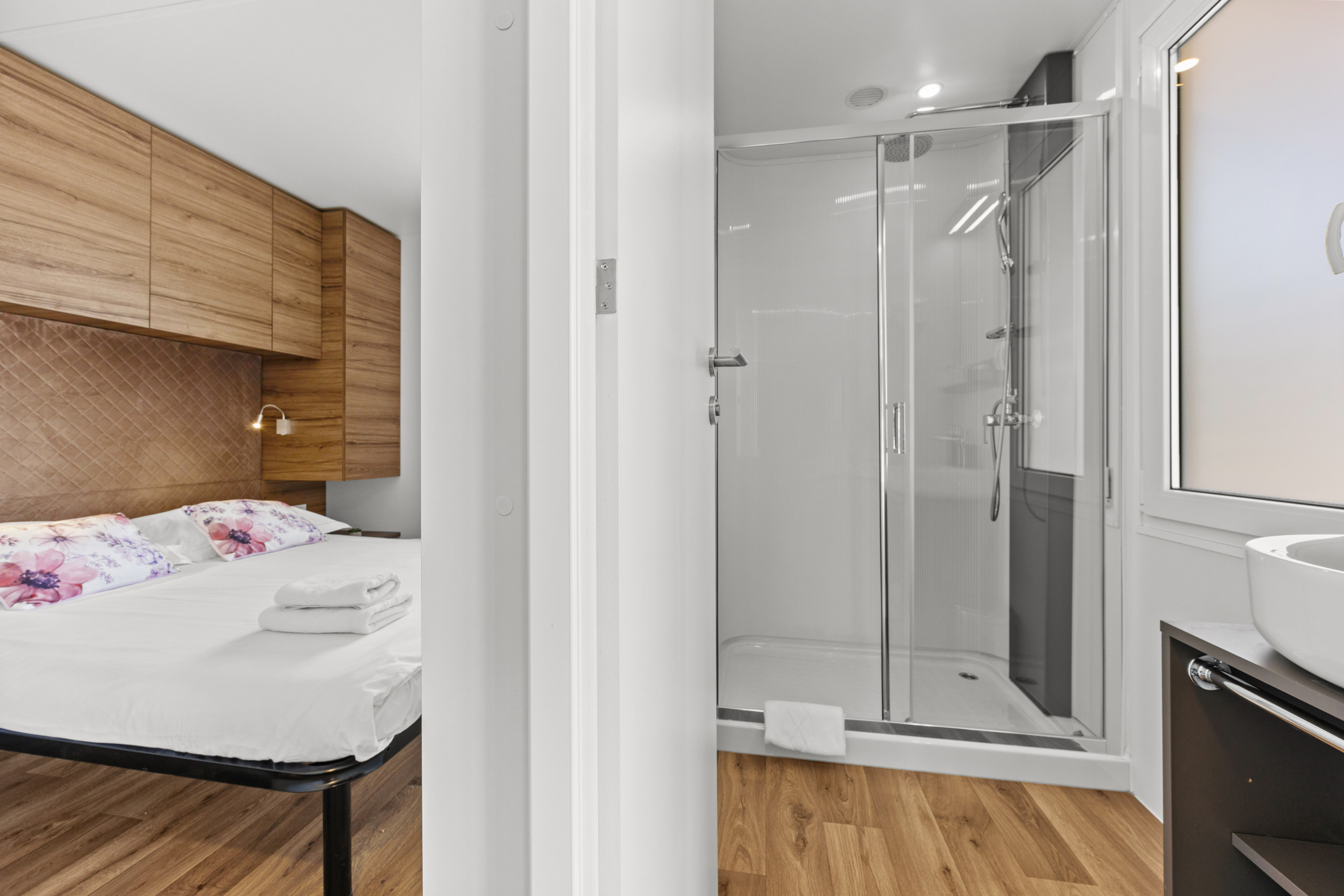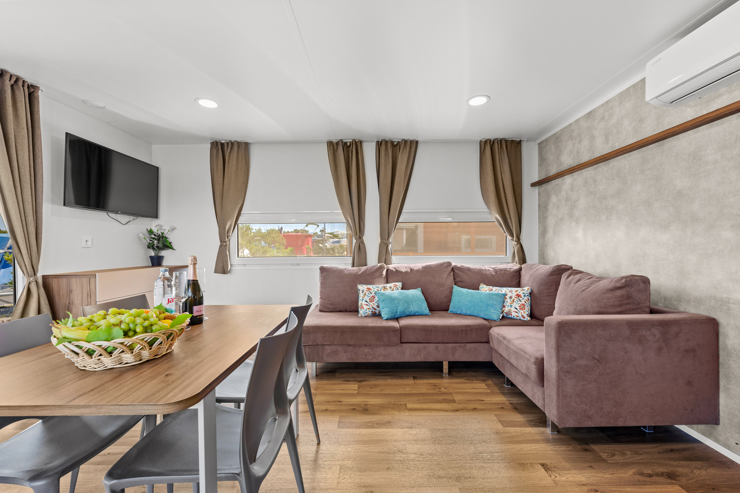 The mobile home features two comfortable bedrooms with a mix of double and individual beds, comfortably accommodating up to 5 guests ( max 4 adults and 1 child up to 12 years old). The spacious interior boasts a modern kitchenette fully equipped with essential appliances including a dishwasher, coffee machine, and microwave. Enjoy entertainment with a flatscreen satellite TV and complimentary WiFi throughout the property.