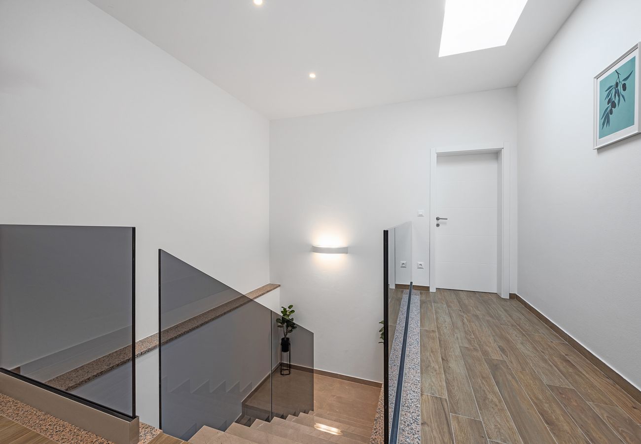 Jacuzzi and sunbeds are located on the balcony on the upper floor of the house. You can access the balcony from the hallway, but also from one bedroom with its own jacuzzi tub in the bathroom. Another bedroom is located upstairs, with its own bathroom and TV.