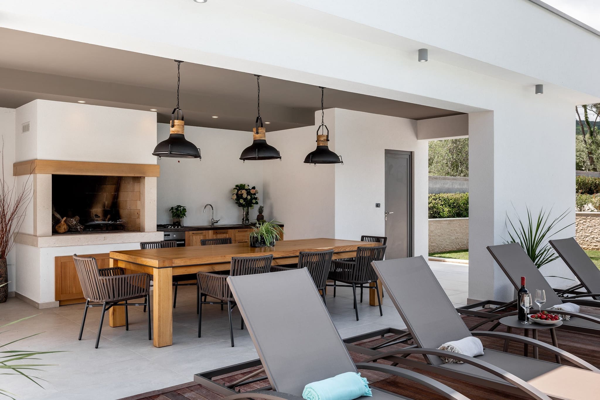 After taking a swim in the pool, guests can use an outdoor shower, or enjoy the sun on the sun loungers around the pool.