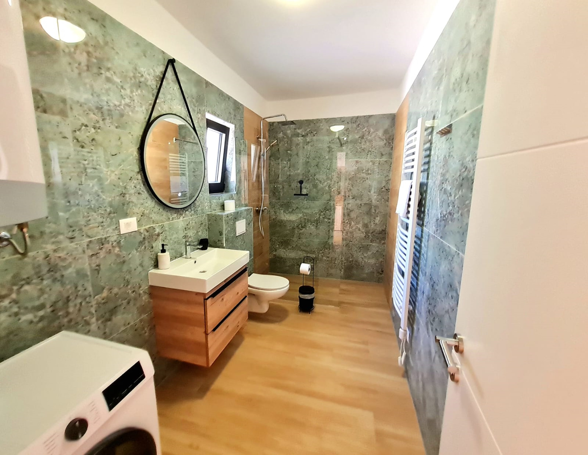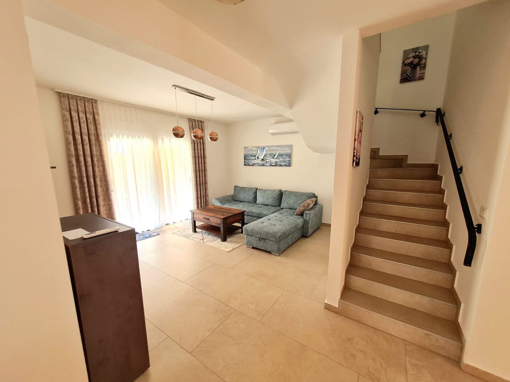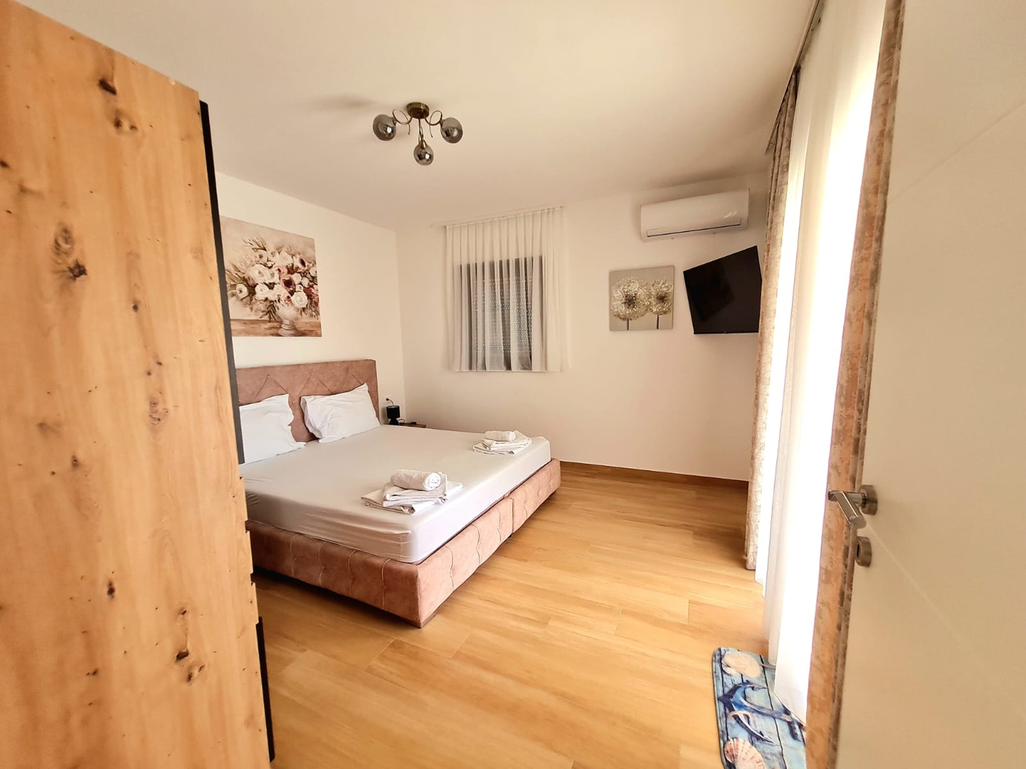 Practical features include two private parking spaces, two bathrooms with showers, as well as a washing machine. The kitchen is equipped with a stove, oven, microwave, dishwasher, coffee machine, and all necessary kitchenware. Entertainment is covered with three TVs and a smart TV system.